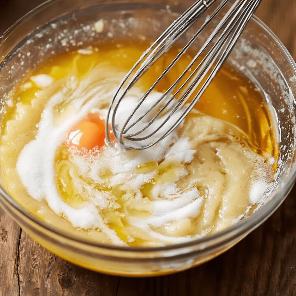 - Смешать жидкие ингредиенты: К банановому пюре добавьте яйцо, сахар и растительное масло. Тщательно перемешайте до однородности.