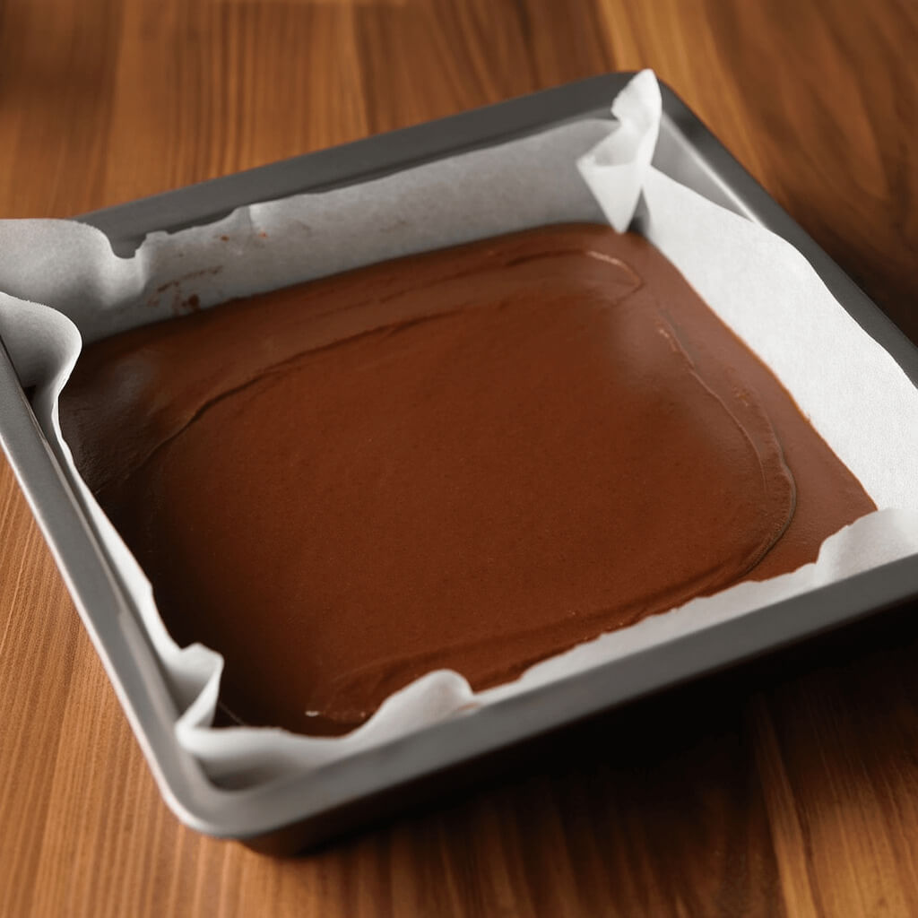 - Выпекать: Форму (примерно 20х20 см) застелите пергаментом и вылейте тесто. Разогрейте духовку до 180°C и выпекайте брауни 25–30 минут.