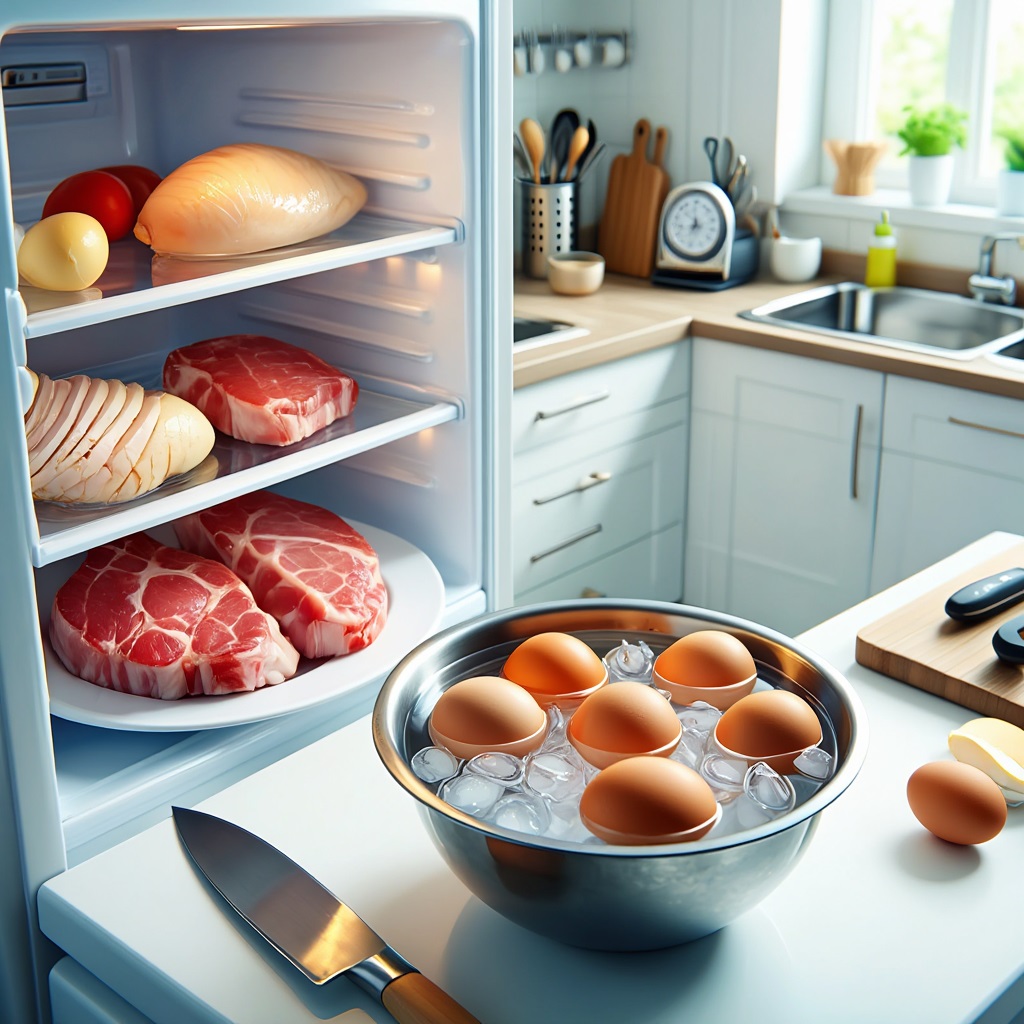 - Яйца отварите вкрутую, остудите в ледяной воде. Выбранный вид мяса подготовьте и полностью охладите в холодильнике — холодное мясо нарезается гораздо ровнее.
