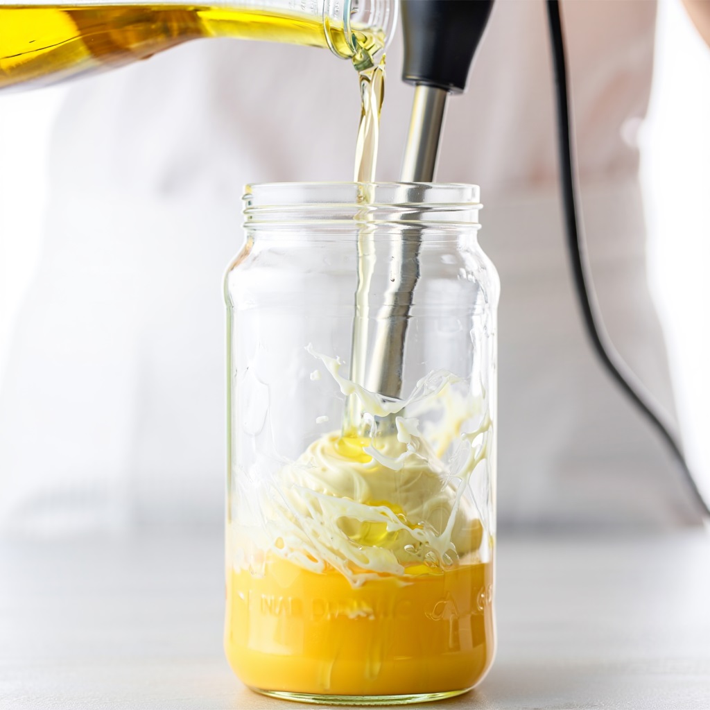 - Домашний майонез за 5 минут: в высокий стакан положите желтки, горчицу, соль и сахар. Опустите погружной блендер на дно, взбейте 10 секунд, затем, не поднимая блендера, тонкой струйкой влейте масло — внизу начнёт собираться густая эмульсия. Когда соус загустеет, можно вливать масло быстрее, постепенно приподнимая блендер. В конце добавьте лимонный сок и ещё раз кратко взбейте — майонез станет светлее и более эластичным.