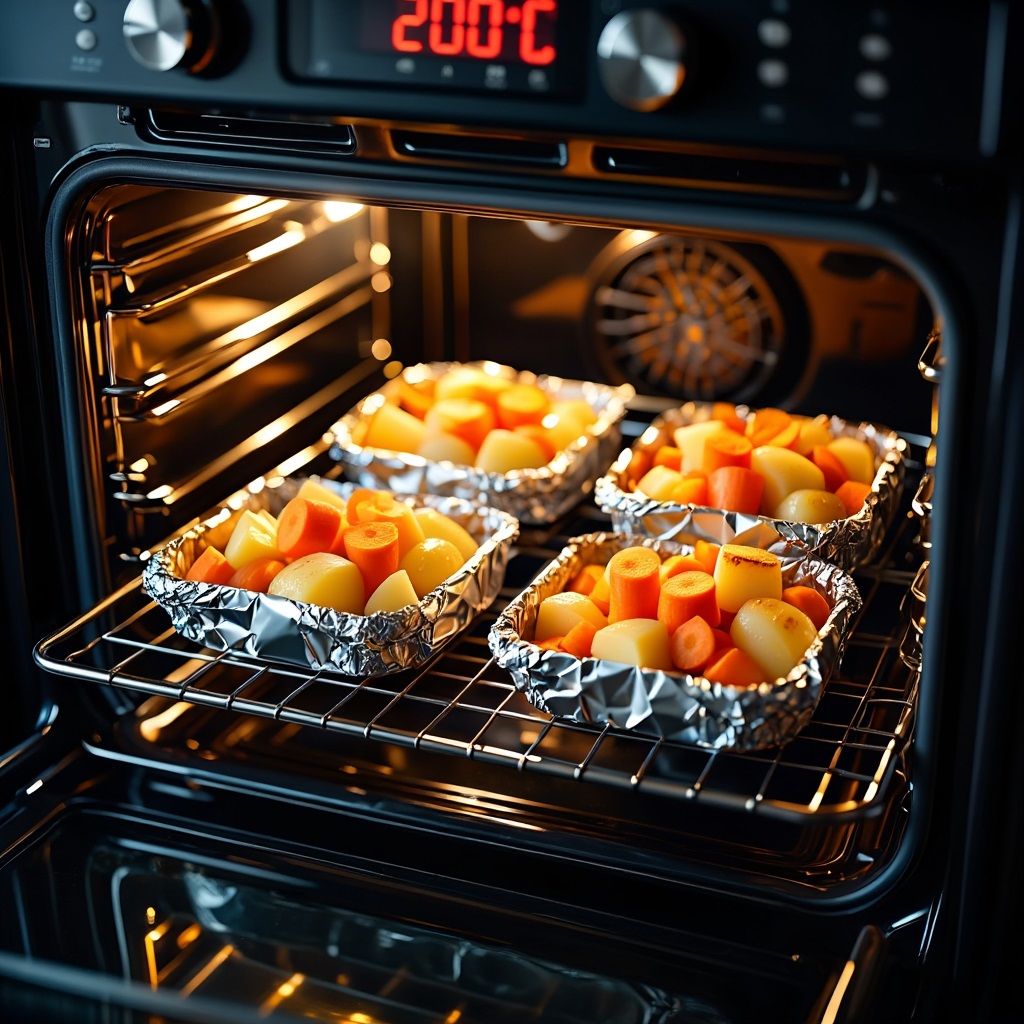 - Запекайте в духовке при 200°C до мягкости (морковь ~30-40 мин, картофель ~40-50 мин).