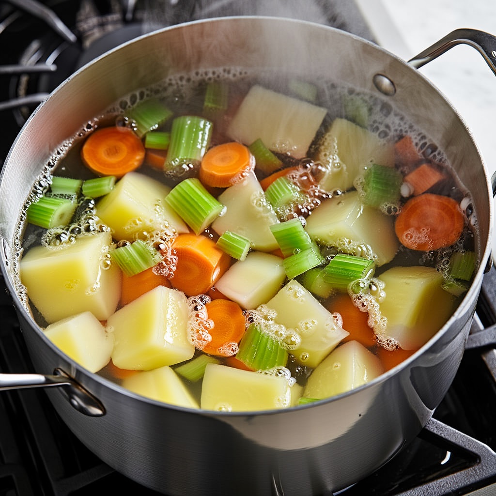 - В кипящую воду добавьте нарезанные кубиками картофель, морковь, лук и сельдерей. Варите 10 минут.