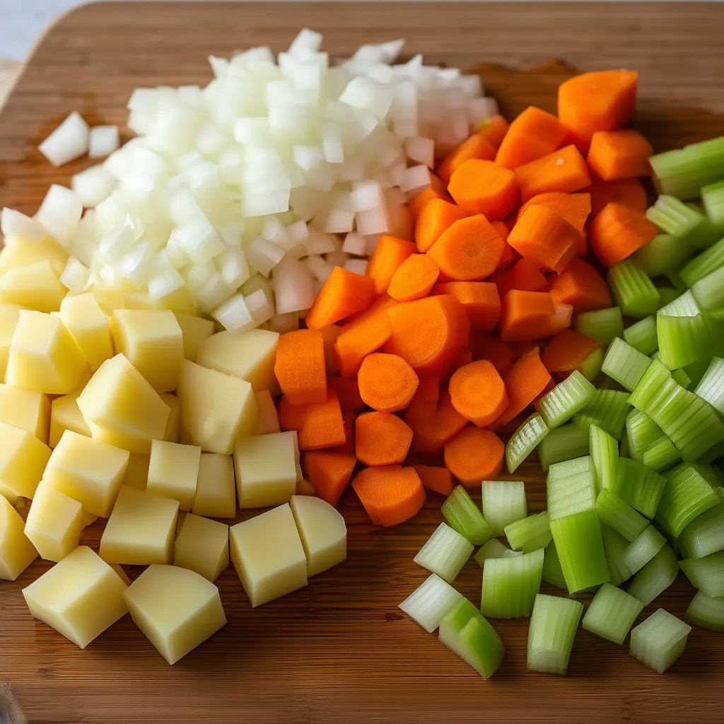 - Нарежьте картофель, морковь, репчатый лук и стебель сельдерея небольшими кубиками.