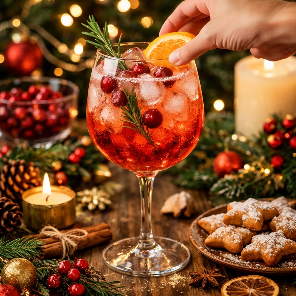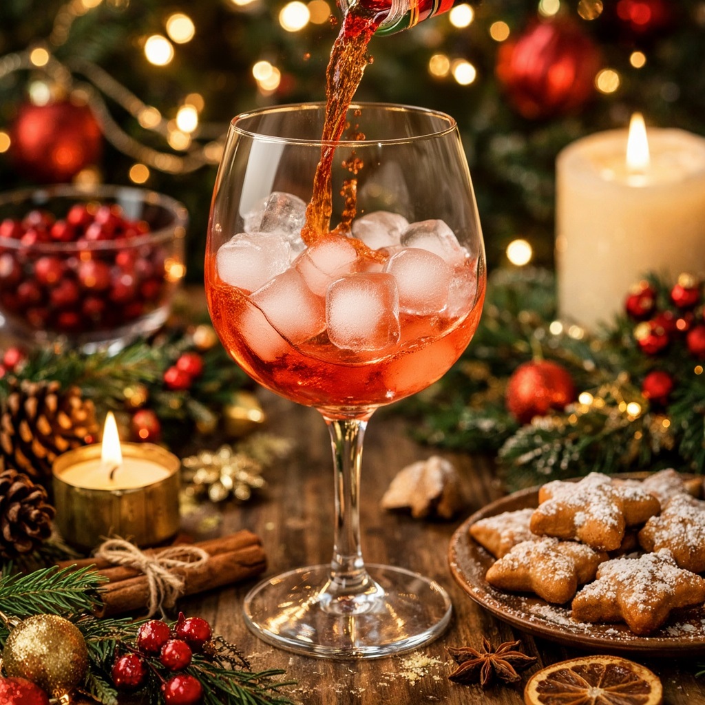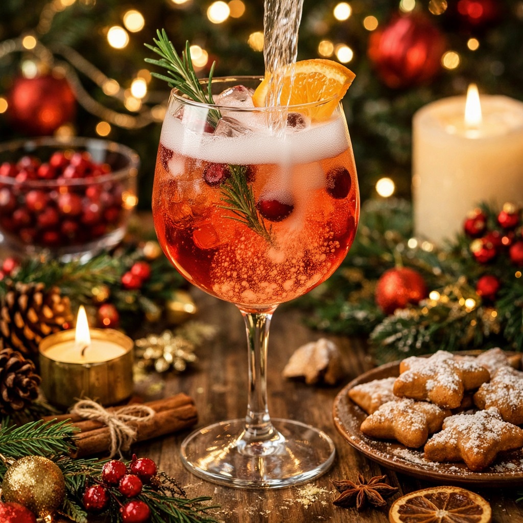 Рождественский шпритц — это лёгкий коктейль на основе игристого вина, аперитива (чаще всего Aperol) и клюквенного или гранатового сока, с небольшим количеством газированной воды.