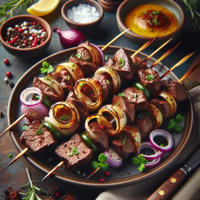 Шашлык из говяжьей печени представляет собой сочные и ароматные кусочки печени, жаренные на открытом огне. Кусочки печенки обрабатываются специями и оливковым маслом, чтобы подчеркнуть их естественный вкус.