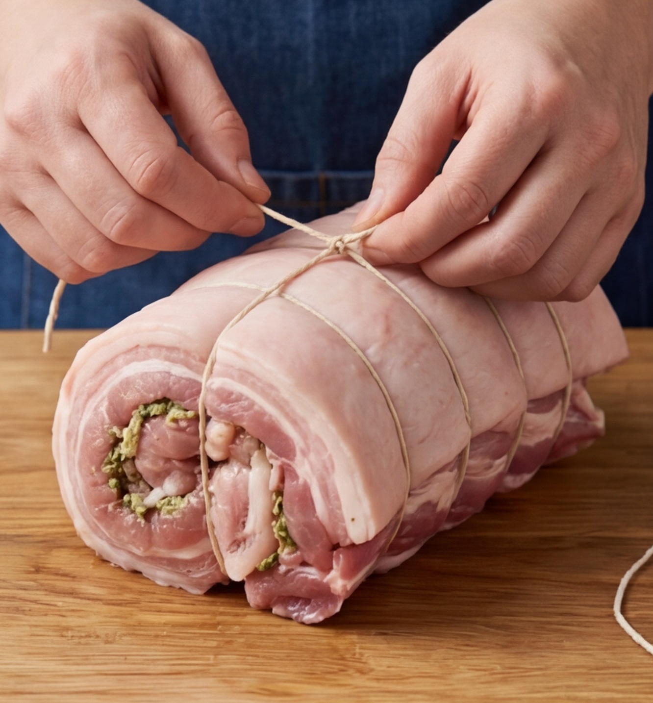 - Плотно сверните мясо в рулет, подгибая края. Перевяжите кулинарной нитью через каждые 3-4 см. Не затягивайте слишком туго, но так, чтобы рулет держал форму.